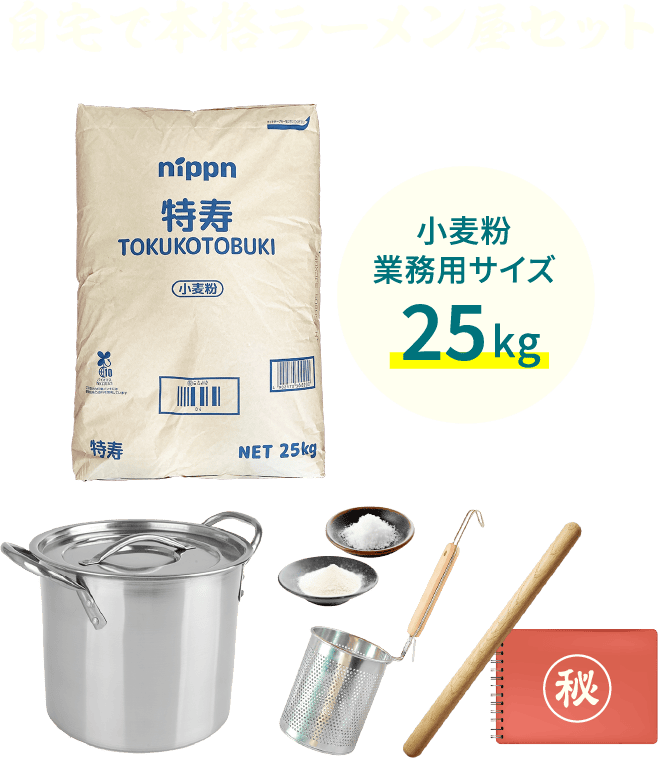 ❶小麦粉25kg ❷寸胴鍋 ❸湯切り ❹塩